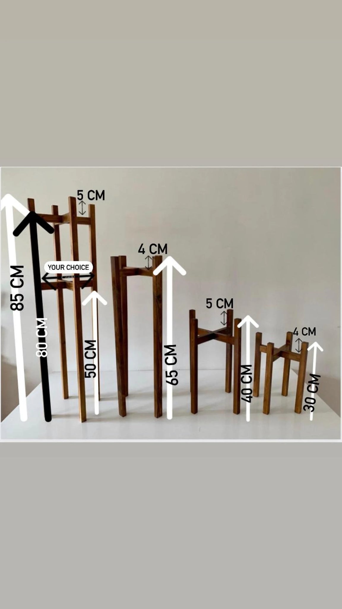 The stand comes in various choices of colours and sizes of width and height the one visible in photos is the Dark oak and to give you more options of sizes we had to split this listing in 6 parts and these are the medium size stands from 50 to cm of height.